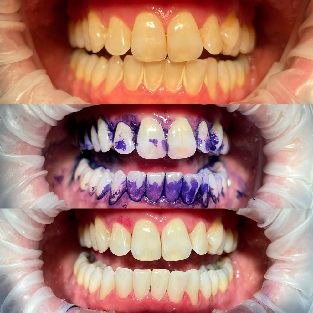 V34 nutzt die Wissenschaft des Komplementärkontrasts: Es enthält einen lila Farbton, der mit den gelben Farbtönen auf deinen Zähnen im Farbkreis gegenüberliegt. Genau wie lila Shampoo, das den Gelbstich bei blondem Haar neutralisiert, sorgt das lila Serum auf deinen Zähnen für eine sofortige visuelle Aufhellung, indem es die gelben Pigmente neutralisiert und ein strahlenderes, weißeres Lächeln hinterlässt.